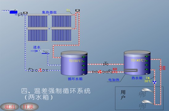 1)、采用2个水箱:一个作为集热水箱,一个作为恒温供水水箱。置于楼顶承重位置,24h供应热水。