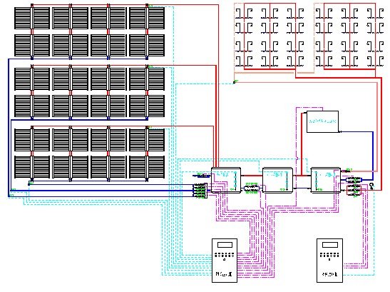该太阳能热水工程为住宅用户热水工程,太阳能三高集热站放置在锅炉楼顶及院内上空,水箱在锅炉房2楼内。满足720户全天候用水,每天可提供60℃热水量为60吨以上。不够的热量由燃油锅炉提供。