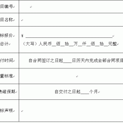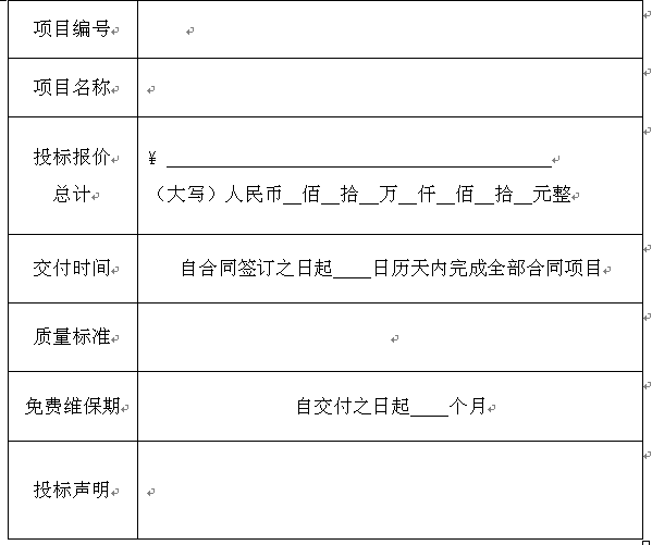 上海太阳能工程-上海湘宸太阳能公司15821413123是一家以太阳能热水器生产为主的太阳能工程厂家,公司在太阳能行业有做过的工程案例有:平板太阳能热水器,阳台壁挂式太阳能热水器,分体太阳能,平板分体太阳能热水器工程,等,公司承接太阳能热水器工程,太阳能采暖,太阳能发电,太阳能空调等。 如果您有这方面的需要,我们可以免费给您勘察现场,给您免费做方案与预算报价等,一套太阳能热水工程设备系统,所投资成本是现在所用能源三年费用的上一套太阳能热水工程设备,前三年收回投资成本后可以免费使用七到十年以上,节能环保省钱看得到。 开标一览表 投标人:————————————————(盖章) 法定代表人或其委托代理人:——————————————————(签字或盖章) 日期:_____年____月____日 投标报价明细表 项目名称:——————价格单位:人民币元 投标人:——————————————(盖章) 法定代表人或其委托代理人:————————————————(签字或盖章) 日期:_____年____月____日 商务条款偏离表 注:1.商务条款内容包括交货期、付款方式、质保期等; 2.即使供应商在报价文件中进行了描述或无商务偏离,也要提报该表或注明“无偏离”字样;若未提报该表,即视为完全响应招标文件。 供应商:(公章) 法定代表人或供应商全权代表:(签字或印章) 日期:———年————月————日 同类项目业绩一览表 供应商:————————————(公章) 法定代表人或供应商全权代表:————————————(签字或印章) 日期:————年————月————日 技术条款偏离表 注:即使供应商在报价文件其它部分中进行了描述或无技术偏离,也要提报该表或注明“无偏离”字样;若未提报该表,即视为完全响应招标文件。 供应商:————————————(公章) 法定代表人或供应商全权代表:————————————(签字或印章) 日期:————年————月————日 投标保证金 ————————(招标人): 我单位已经按照招标文件的要求提交了————————————————————————— 项目的投标保证金————————元(小写:¥)(详见收据)。 根据招标文件的规定,我单位严格按照程序履行投标保证金退付手续。我单位法人开户行和基本账户如下: 开户行:———————————————————— 基本账户:———————————————————— 投标人:——————————————————————————(盖单位公章) 法定代表人或委托代理人:————————————————————(签字) ————年————月————日 编辑:上海太阳能工程 本文由太阳能热水器厂家-湘宸太阳能公司【www.shyfjn.com】转载太阳能联盟网后整理发布,如需转载,请注明出处。 如果您有太阳能方面的需求,也可以直接与我们郑工联系:15821413123