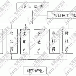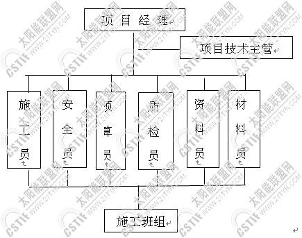 为了保证工程的顺利进行,本公司建立热水系统安装项目经理部,强化统一指挥、统一协调、明确职责、加强施工现场管理、严格按照施工图纸、施工规范标准施工、确保施工进度、竣工建设成为样板工程,设立安装项目经理、项目技术负责人、施工技术员、质量安全员、材料设备员、资料员、预算员、施工班组,其组织机构图如下: