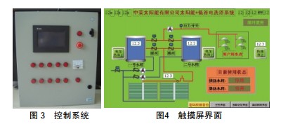 夜间到达谷电时段(23:00~07:00),系统会根据两个水箱液位高度及水温情况,自动计算出两个水箱的热量值,选择其中较高的一个开启电加热器,对其进行低谷电蓄能(热量相同时,选择液位量较少的水箱;液位也相同时,选择一号水箱),如果水箱液位未满,则开启上水电磁阀及对应该水箱的集热电动阀(D1或D2),开始上水,水满则停;当该水箱温度达到设定温度时(60℃),停止加热,同时该水箱被选择为“供热水箱”,开启对应水箱的供水电动阀(D3或D4),客户用水时,水泵(P3)运转,使用该水箱中的热水。图3为控制系统,图4为触摸屏界面。