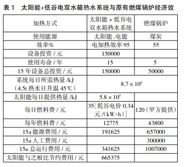 5.1根据表1对比可知,太阳能+低谷电双水箱热水系统虽然新增投资15万元,但每年节省费用5.1万元。即该系统改造后预计3a即可收回初投资,符合动力要求。